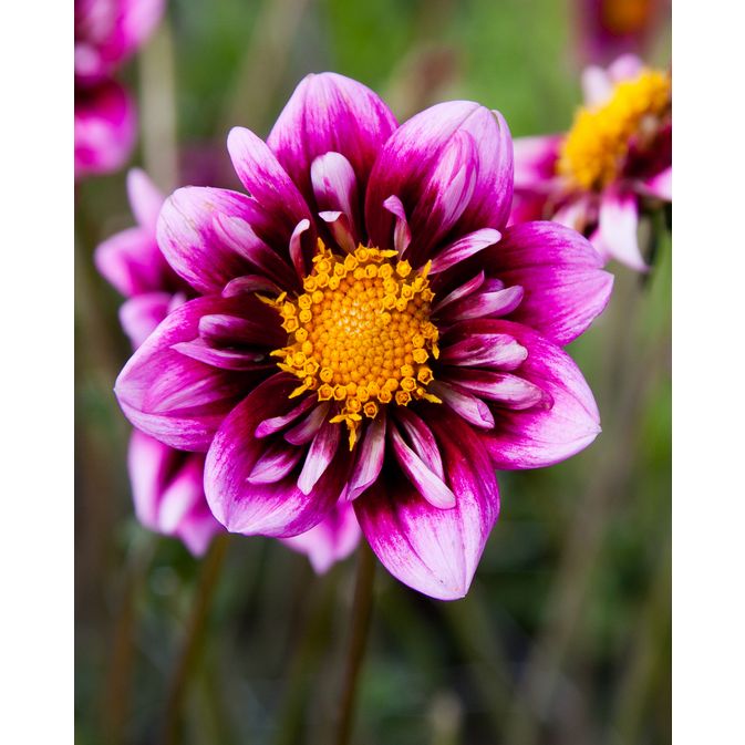 | Bloom Size: 3" Plant Height: 2-3' Form: Novelty Color: A ring of rounded, magenta-red petals, fading to sweet pink at the tips. Listing is for 1 tuber |