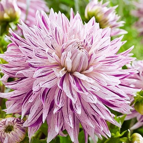 | Bloom Size: 8" Plant Height: 4.5' Form: Dinnerplate Color: White with lilac stripes Listing is for 1 tuber |
